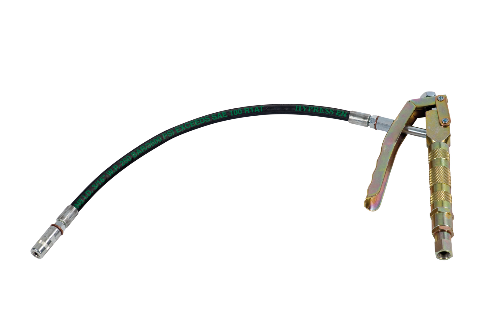 Пистолет для раздачи густых смазок с гибким носиком и 4-ч кулачковым фитингом. Длина гибкого шланга 400 мм. Оснащен антискручивателем с резьбой 1/4" F