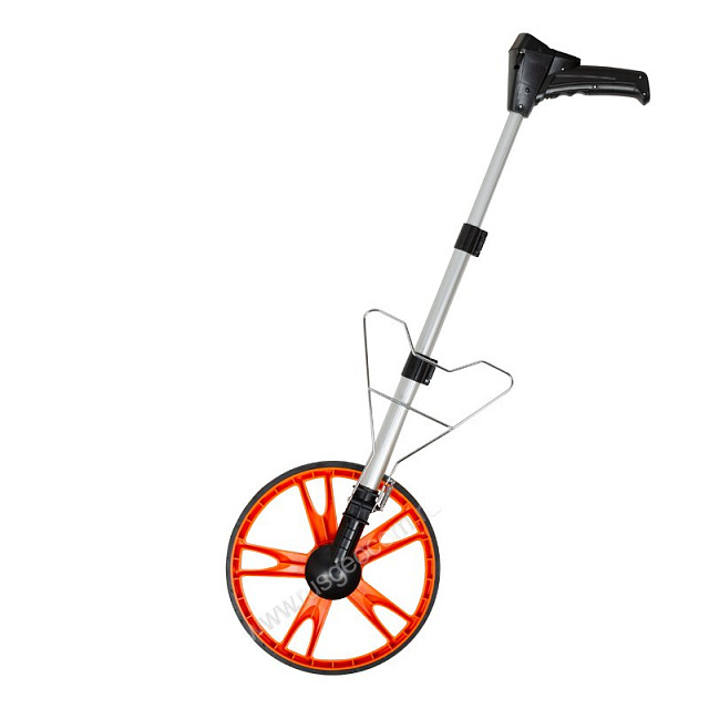 Дорожное колесо крепится на телескопической рукоятке. Выдвижная конструкция дает возможность отрегулировать рукоять по высоте для удобного перемещения курвиметра RGK Q318. В сложенном состоянии прибор имеет компактные размеры и легко помещается в багажник. В нижней части закреплена подножка для удержания колеса в вертикальном состоянии неподвижно.