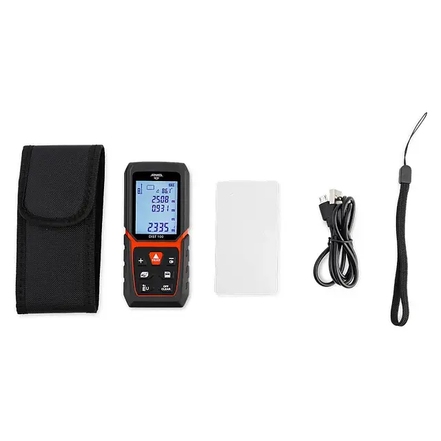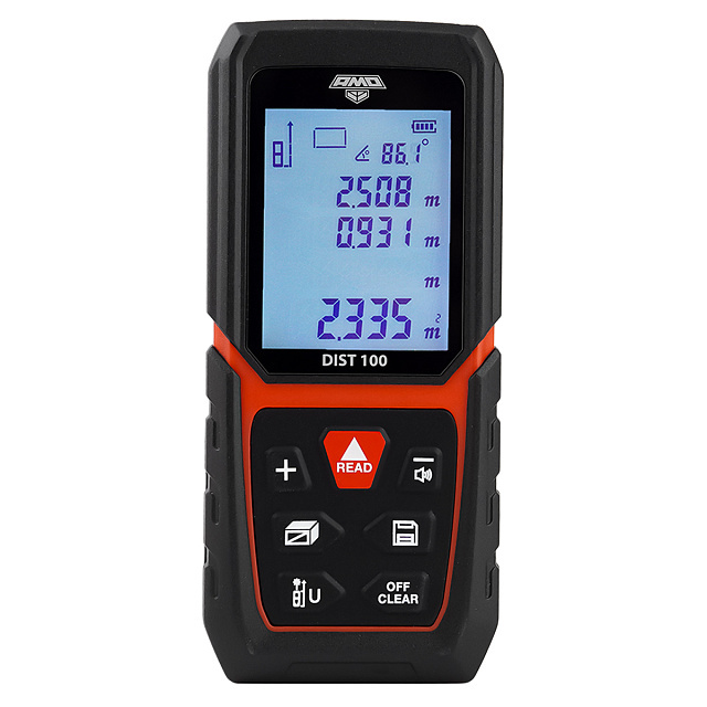 Лазерный дальномер AMO DIST 100 обеспечивает измерение дистанций на расстояниях до 100 м с 2-миллиметровой точностью. Наличие встроенного инклинометра с диапазоном измерения углов ±90° а также реализация вычислительных функций с поддержкой режима определения недоступных размеров и дистанций косвенным методом по теореме Пифагора позволяет определять горизонтальные и вертикальные размеры, площадь поверхностей и объем помещений, контролировать точность выставки и уклон конструкционных элементов, и т.п.