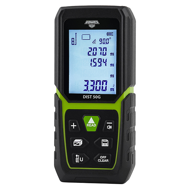 Лазерный дальномер AMO DIST 50G с рабочим диапазоном до 50 м, снабженный встроенным инклинометром, способен выполнять измерение расстояний и углов, вычисление площадей, объемов, недоступных размеров, а также прочих косвенных и производных параметров. Инструмент защищен от пыли и брызг в соответствии с требованиями IEC 60529 по категории IP54 и подходит для использования как в помещениях, так и на открытом воздухе. Измерения могут выполняться с руки или со штатива – когда необходимо обеспечить предельную точность на больших дистанциях, для чего с обратной стороны корпуса предусмотрено соответствующее крепление с внутренней резьбой.