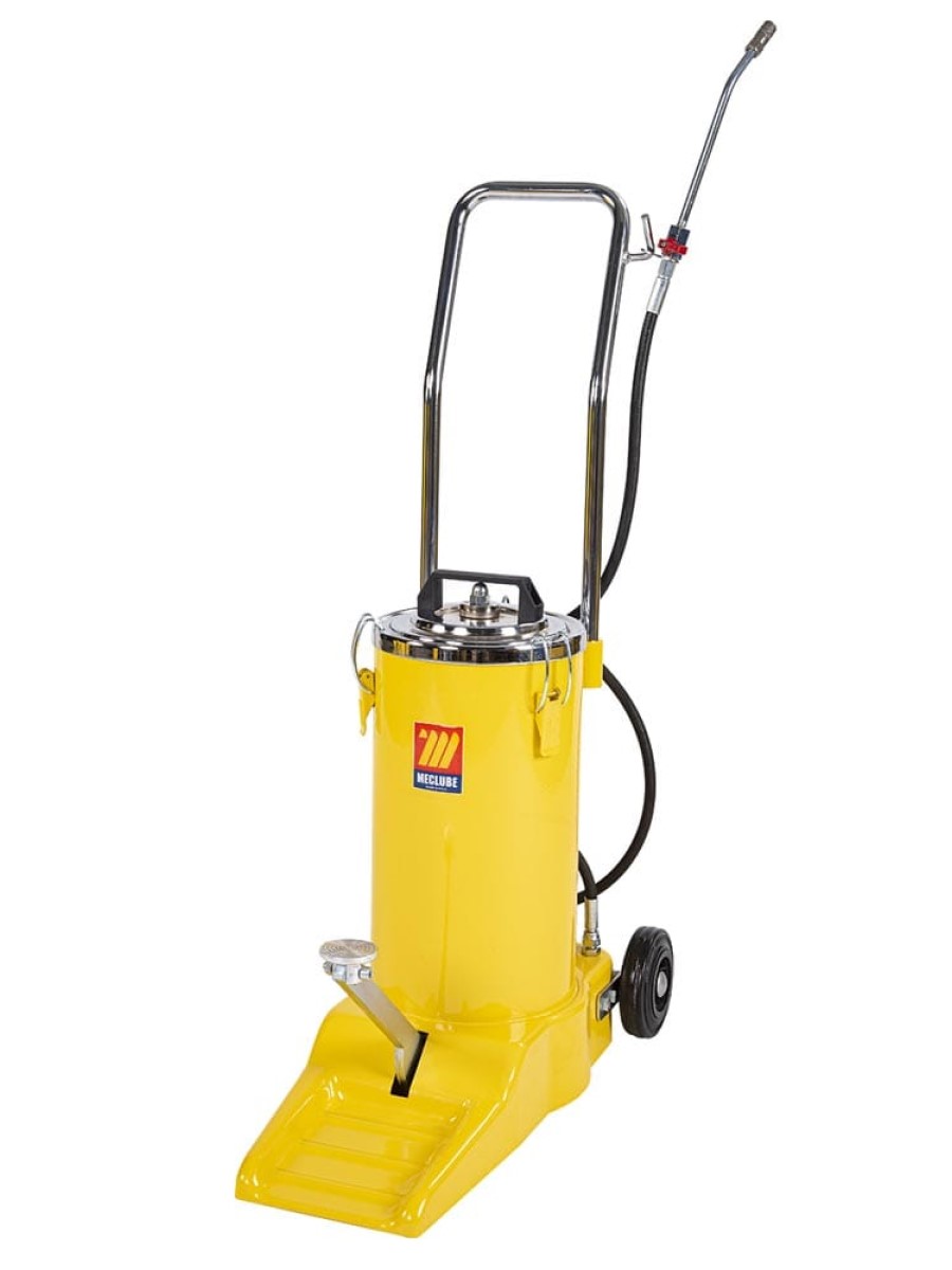 Передвижной педальный нагнетатель густых смазок с емкостью 16 кг и производительностью до 40 г за 10 циклов. Выходное давление смазки: 400 бар.