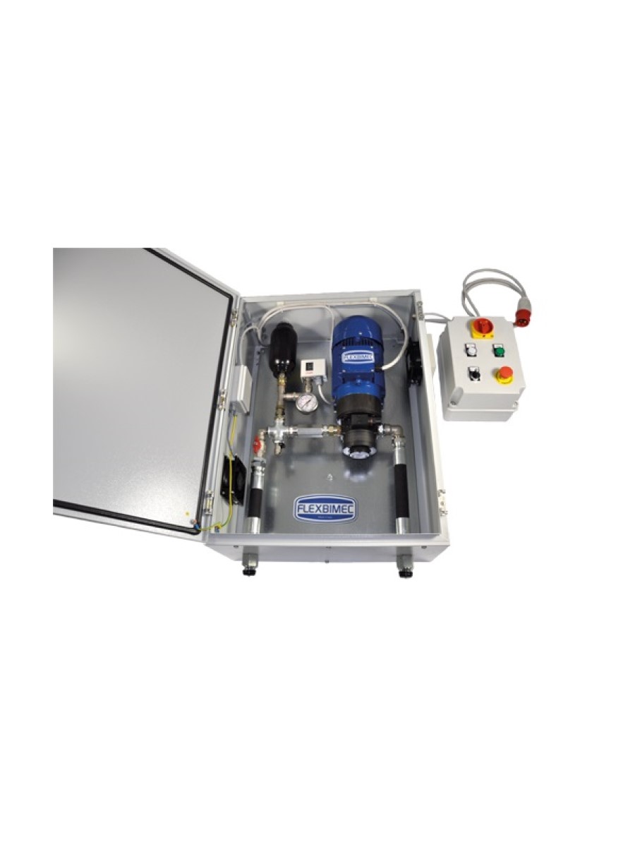 Комплект Flexbimec для подачи масла в металлическом ящике, состоящий из: электрического шестеренчатого насоса (артикул 6136), металлической крышки с замком (артикул 7376) и предохранительного выключателя степени защиты IP 55 с кабелем длиной 3 м и вилкой (артикул 7370).