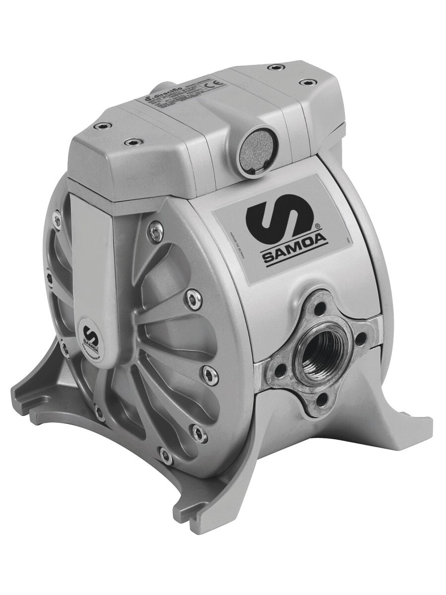 Пневматический диафрагменный насос Samoa DF100 с технологией прямого потока DirectFlow. В насосе жидкость прокачивается через центральную часть насоса, а воздух воздействует на внешнюю сторону мембран, что позволяет снизить потребление воздуха, вспенивание, расслаивание жидкости, вибрации и пульсации; внутренние гидравлические потери по сравнению с конкурентами, а также делает его на 15-20% меньше по габаритам.