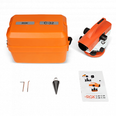 Стандартная комплектация: оптический нивелир RGK C-32, нитяной отвес, юстировочный набор, руководство по эксплуатации, транспортировочный кейс.