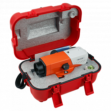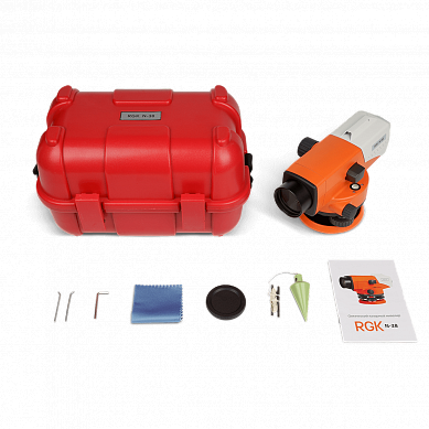 Стандартная комплектация: оптический нивелир RGK N-38, нитяной отвес, юстировочный набор (шестигранный ключ, шпилька), транспортный кейс.