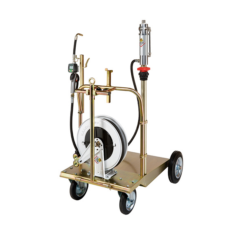 Комплект состоит из пневматического насоса серии 650, оцинкованной тележки, дозировочного пистолета с цифровым счетчиком, раздаточной катушки со шлангом 10 м, кольца для бочки.
