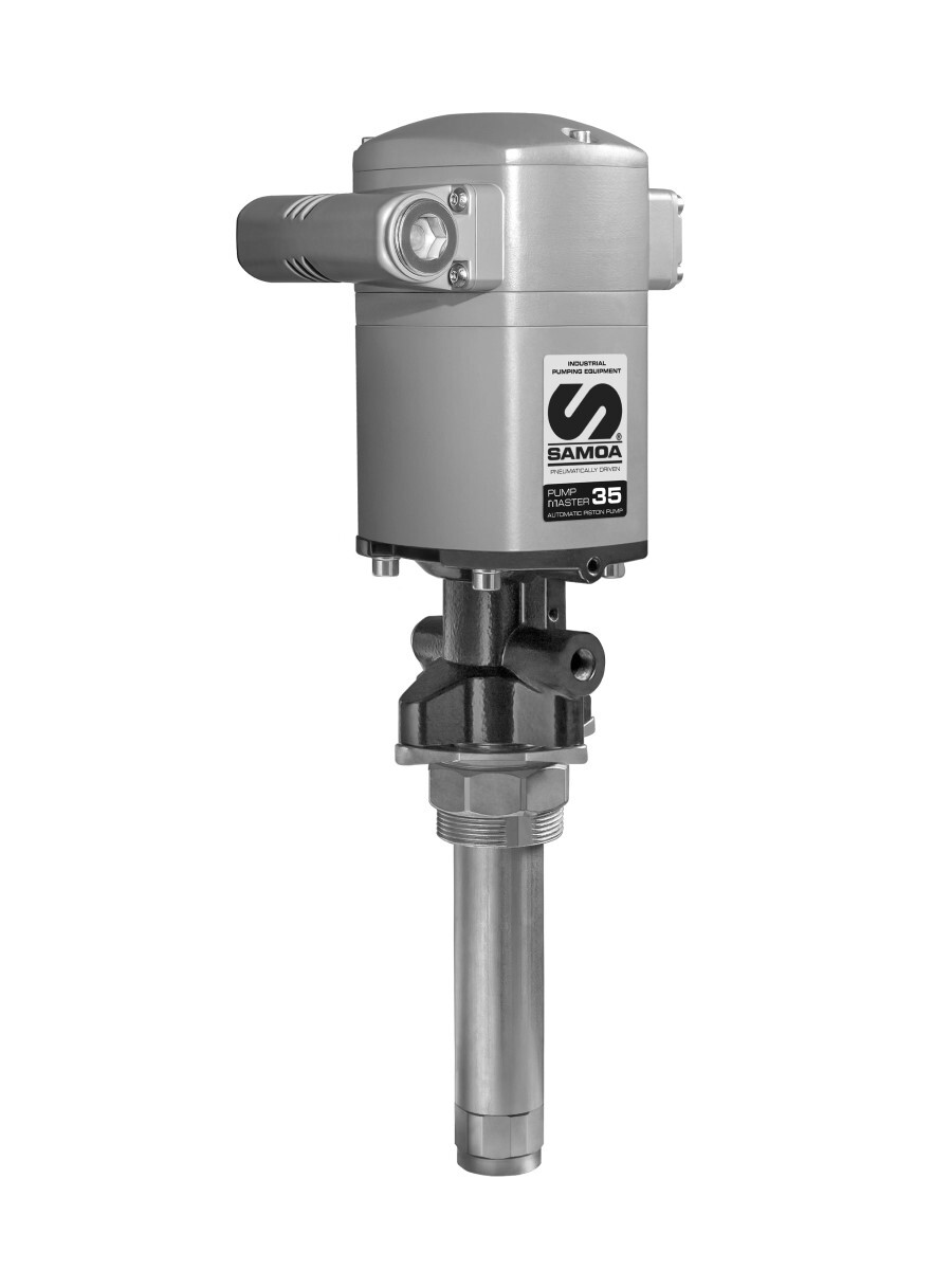 Пневматический насос для масла Samoa PM35 (8:1) двойного действия среднего давления является универсальным - подходит для монтажа на бочку или другую емкость (имеет регулируемый по высоте переходник 2" BSP (M)).
