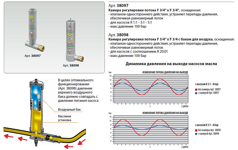 Камера регулировки потока жидкости 3/4" F/F. Оснащена кпапаном одностороннего действия, устраняет перепады давления в системе, обеспечивая равномерный поток. Используется с насосами для масел с коэффициентами сжатия: 1:1; 3:1; 5:1.