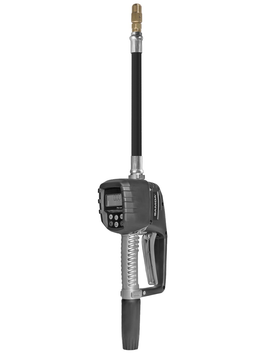 Пистолет для масла со счетчиком с функцией заданного объема (предустановкой), с жестким носиком с четверть-оборотным ручным каплеотсекателем для учета трансмиссионного масла и охлаждающей жидкости.