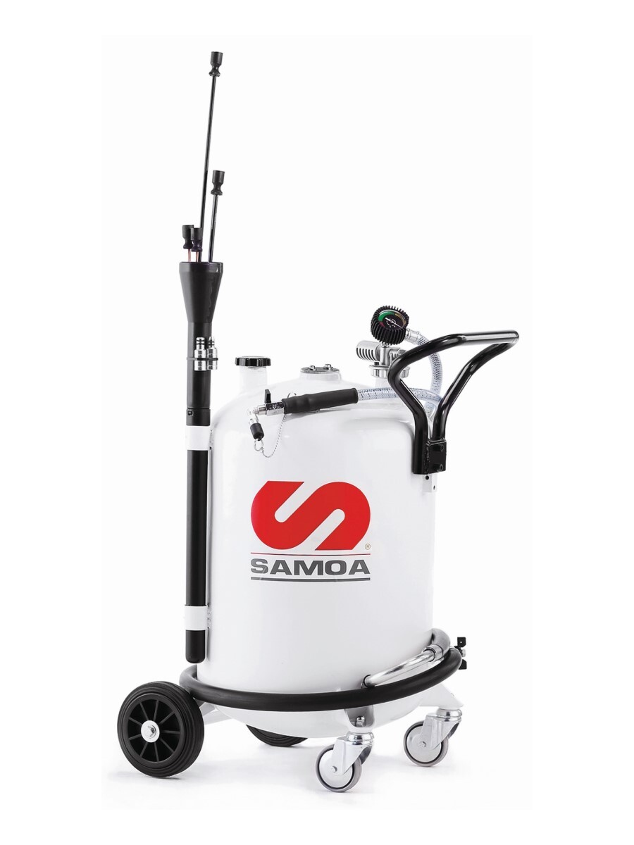 Мобильная установка Samoa для откачки отработанного масла через масляный щуп двигателя. Объем бака 70 л, после создания вакуума в баке установку можно использовать автономно, отсоединив от источника воздуха.
