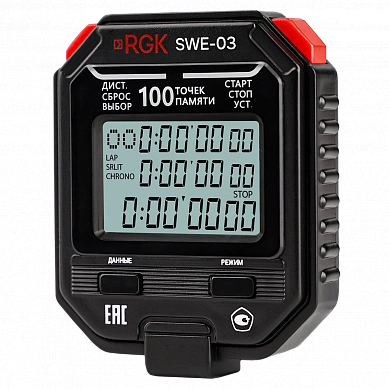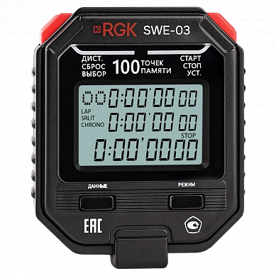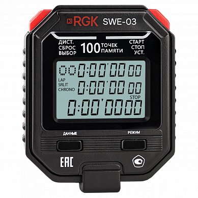 Модель RGK SWE-03 в режиме секундомера позволяет вести хронометраж интервальных событий общей продолжительностью до 10 ч, с последовательной регистрацией до 100 временных промежутков и их автоматическим суммированием. На дисплее при этом одновременно отображается тайминг и номер временного отрезка, суммарный показатель и общее время с начала отсчета с разрешением 0,01 с. Благодаря наличию встроенной памяти на 100 ячеек, обеспечивается возможность документирования промежуточных данных, что исключает необходимость ведения "бумажных" записей. Доступен просмотр сохраненных показаний на дисплее прибора, с определением самого продолжительного и самого короткого результата, и автоматическим расчетом общего усредненного значения.