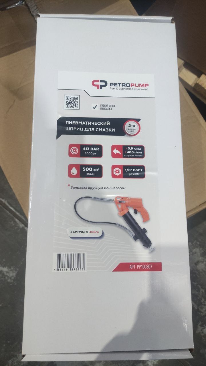Двухрежимный пневматический шприц для смазки объемом 500 см3. Производительность составляет 90 г/ход или 400 г/мин в беспреррывном режиме. Рабочее давление 413 бар. Резьба 1/8" BSPT. Имеет два режима работы: автоматическая непрерывная подача смазки при удержании курка и подача смазки при каждом нажатии.